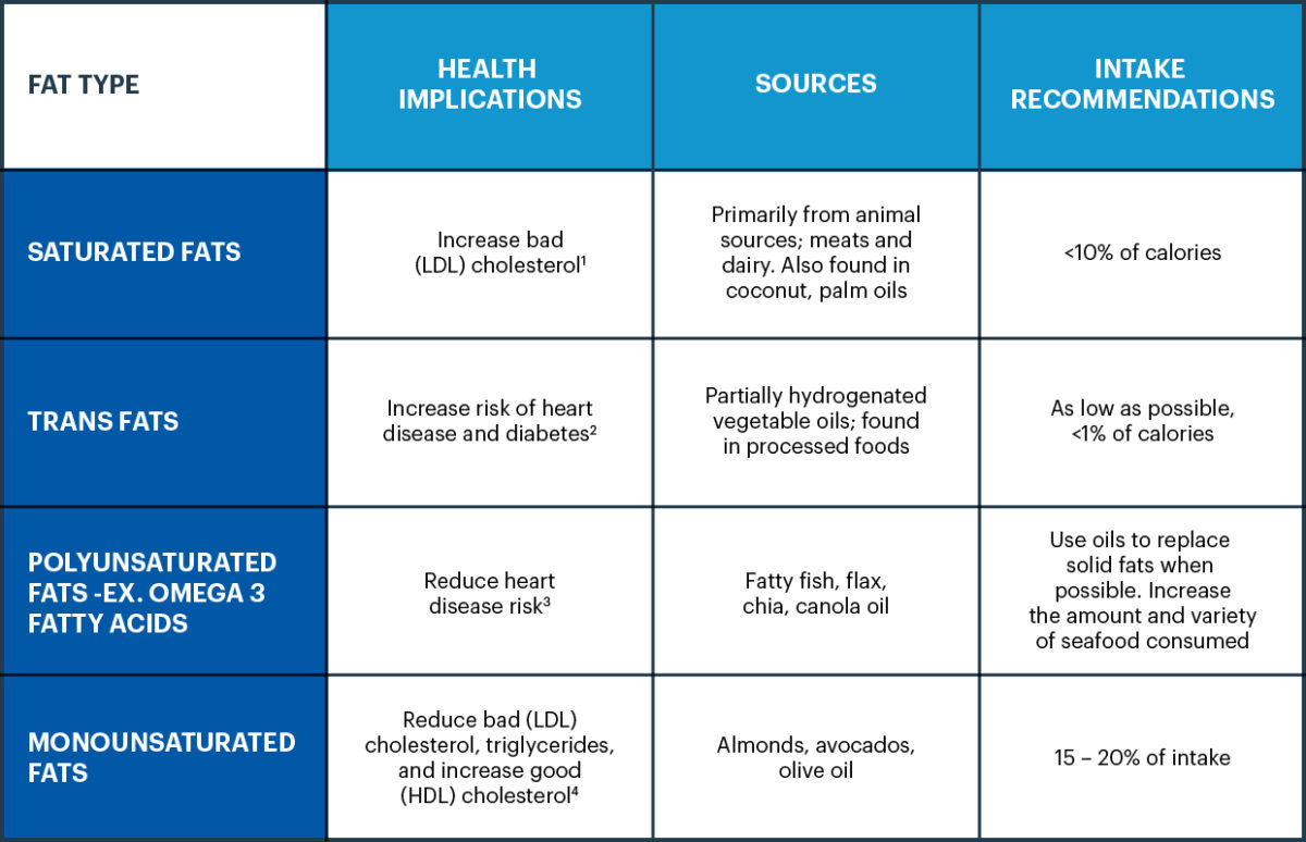Par le passé, on croyait que toute graisse était « mauvaise » pour la santé. Mais la science de la nutrition s’est développée au fil de recherches plus poussées et précises. Nous savons que les acides gras sont la principale forme de graisses alimentaires et sont essentiels pour votre santé, parce qu’ils maintiennent la croissance des cellules, protègent les organes et aident à la production d’hormones. Nous savons maintenant que toutes les graisses ne sont pas identiques. Voici les quatre principaux types de graisses alimentaires :
