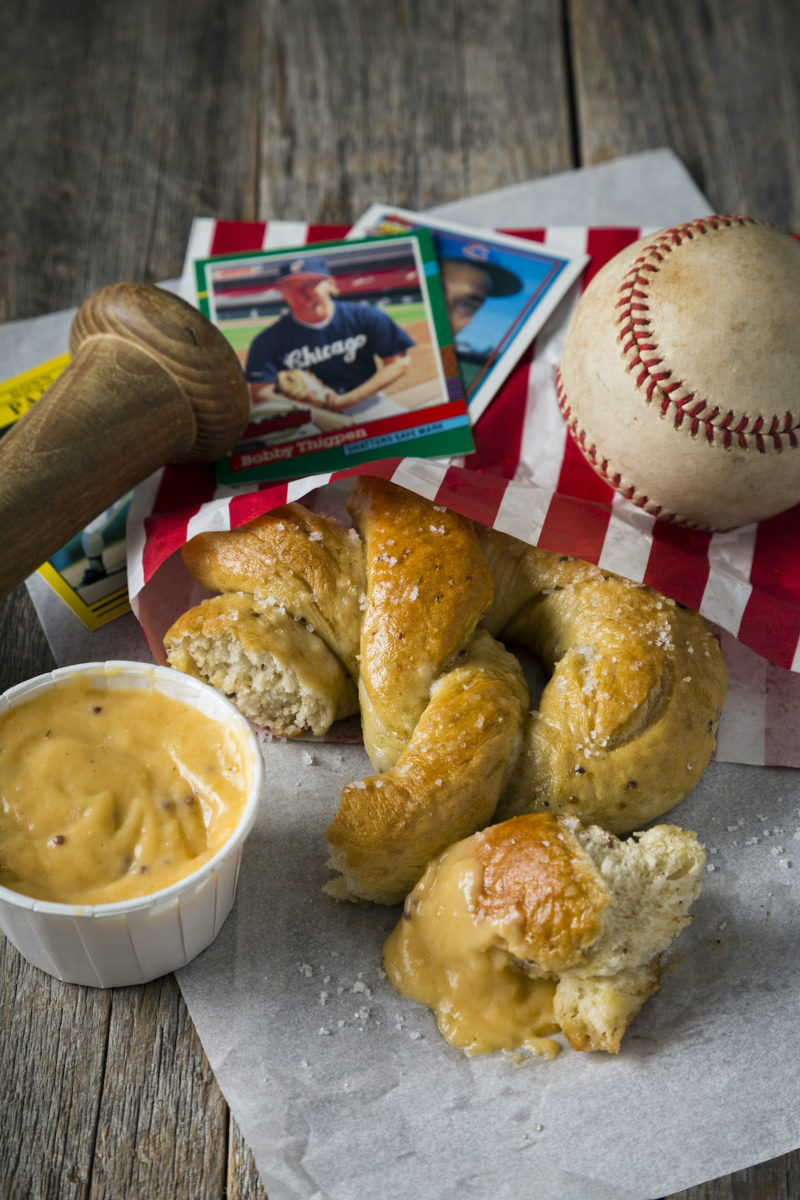 Si le baseball et le début officiel de l’été vous manquent, confectionnez ces bretzels à tremper dans une sauce au cheddar et à la moutarde qui vous permettront de regarder un match sur YouTube en prétendant être assis dans un stade.